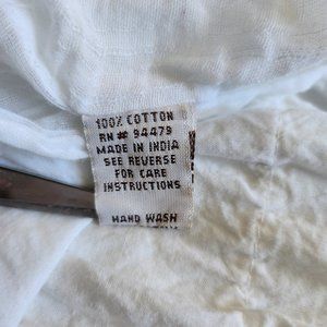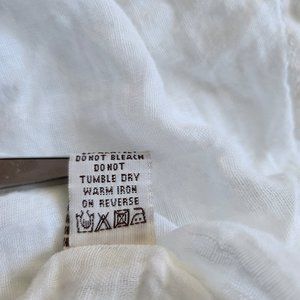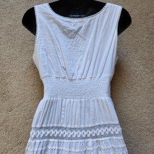 White dress with v-neck, fitted bodice with wide elastic waist. Skirt is slightly A-line with stitched ribbon detail and crochet hem.