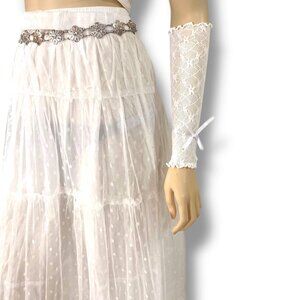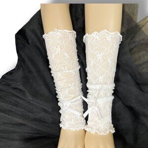 White lace textured long arm cover, arm warmer fingerless gloves. Lightweight adjustable for year round accessorizing! Stretch in material to fit most all sizes. Great style to elevate your personal style! Elbow length arm covers, crafted from a beautifully textured lightweight lace fabric, these arm warmers are not only adjustable for a perfect fit but also in style. You can wear them at their full elbow length for an elegant look or scrunch them up for a more casual vibe. These arm cover make a fantastic accessory that complements a variety of styles year-round, if you’re embracing romantic aesthetics coquette. Perfect for any occasion, from festivals, parties, casual outings! White long arm sleeve fingerless gloves!