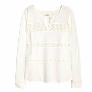 Long-sleeved top in soft jersey with a woven front section. V-neck, lace inserts at front, and slits at sides.