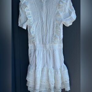 Bust 30 inches Waist 24 inches Length 32 inches Elegant white dress with lace trim and ruffled hem. Perfect for any occasion.
