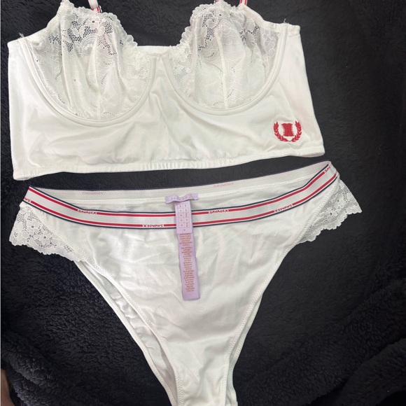 Rihanna’s Savage Fenty,white intimates set featuring delicate lace trim. Perfect for comfort and style.