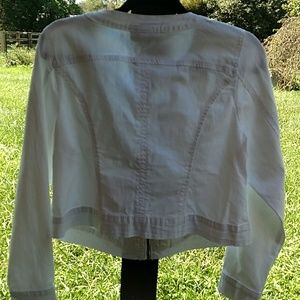 Adorable white, light weight, jean jacket. Ruffles along the zipper. Has pockets.
