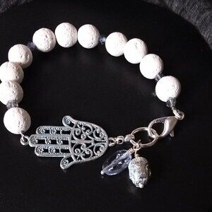 White Lava Bead Bracelet | Hamsa Hand & Buddha Charms | Blessings & Protection