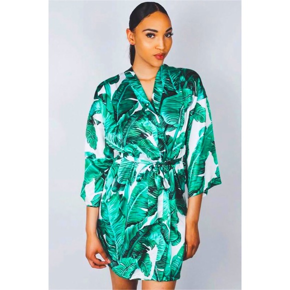 This soft and luxurious robe is a must for your next getaway! It features a tropical leaf print design on a soft white background. It comes with a removable belt. Pair it with the matching pajama short set for stylish lounging and slumber.