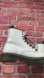 These shoes are brand new without the box! They are a pair of classic white leather Dr. Martens combat boots in a women's size US 7 / EU 38. They lace up the front with black and white contrast detailing. They have low platform soles with very slight heels. They have some seam detailing across the shoes, and they have the classic yellow stitching and tabs that we all love and know about Dr. Martens. There is a mark on the side which is important to note and is pictured. These boots are timeless, versatile, and super edgy!