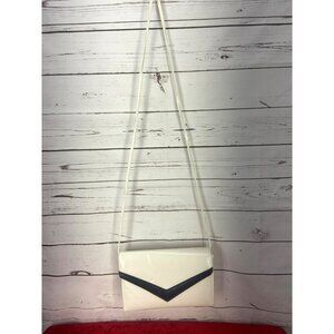 This chic white leather clutch features a long shoulder strap for versatile styling. The navy trim adds a sophisticated contrast, making it perfect for both day and night occasions.