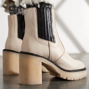 These shoes are brand new in the box! They are a pair of white leather Free People James Chelsea platform heeled boots in a women's size US 8.5 / EU 38.5 and in the color bone. They are primarily white leather with gorgeous black contrast detailing. They pull on with zippers on the sides and rounded toes. They have an almost translucent rubber platform that also make up the heels. The leather has a rustic look to it, and these boots are an amazing cross between bohemian and trendy!