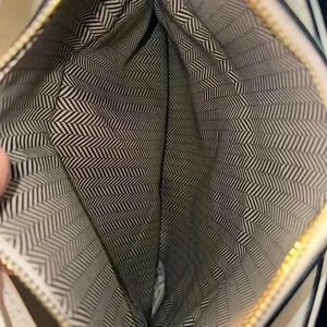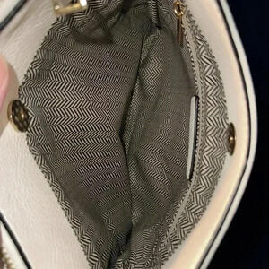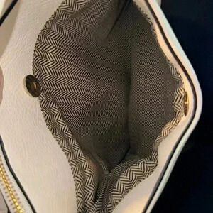 Pretty soft white leather with gold zippers, clasps, etc. (see pictures)