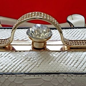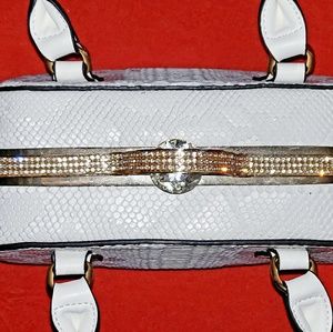 Never used, beautiful white, python embossed leather handbag. Gold hardware. Diamond gem and bling closure. Separate, interior compartments with pockets. Feet for protection. Comes with a detachable strap.