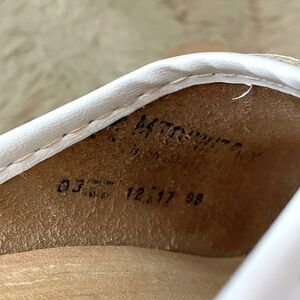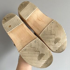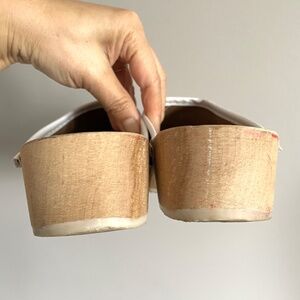 White leather, classic slip on, wooden clogs. Heel is approx 1.75" high.