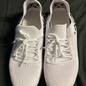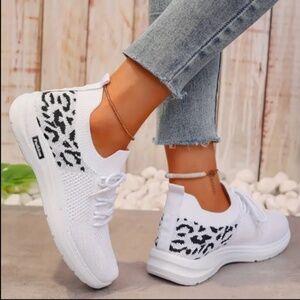White with black leopard print sneakers. Summer breathable, soft, stretchy, mesh sneakers. Easy slip on & off. Laces. Casual, comfortable walking shoe. Perfect for running/jogging, walking, daily commute & sports activities.