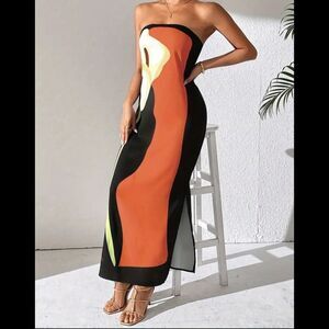 Beautiful strapless sundress in a tangerine orange color with white lily design.
