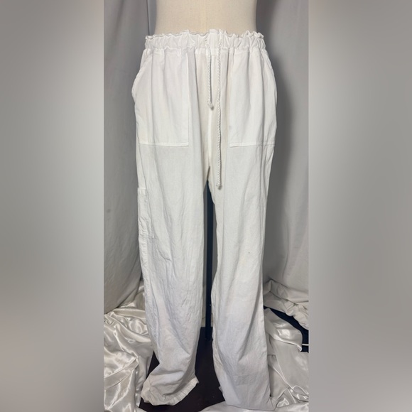 Effortless white linen-blend lounge pants with a relaxed, breezy fit and that quiet-luxury, coastal-boho look. Pull-on style with elastic waist + rope drawstring, front patch pockets, and utility-side pocket. Lightweight, soft woven fabric — feels like a cotton linen blend.