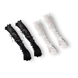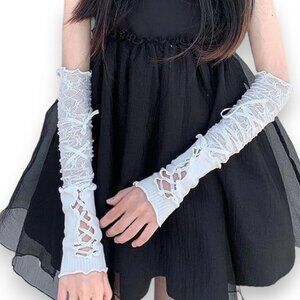 White long Lace up corset textured arm warmers, great year-round arm covers, fingerless gloves! Combining Y2K ,street chic to romantic elegance, these arm warmer gloves feature intricate lace-up corset detailing and are made from a stretchable cotton-spandex blend for a comfortable and versatile fit. Great look for daily, to wedding accessories! If you prefer to wear them fully extended for a bold and dramatic look, or scrunched for a more laid-back vibe, these gloves are the ultimate accessory for any occasion - from festivals and weddings to daily style. Lightweight and breathable, they add a daring and fashionable touch to any outfit, making them a must-have for any risk-taker looking to make a statement.