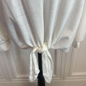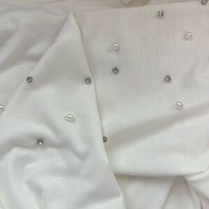 This white blouse features a relaxed fit with a stylish tie front detail, perfect for a versatile look. The long sleeves add a touch of elegance, making it suitable for both casual and dressy occasions. Crafted from soft, lightweight fabric, it ensures comfort throughout the day. Rhinestone and pearl sleeves.