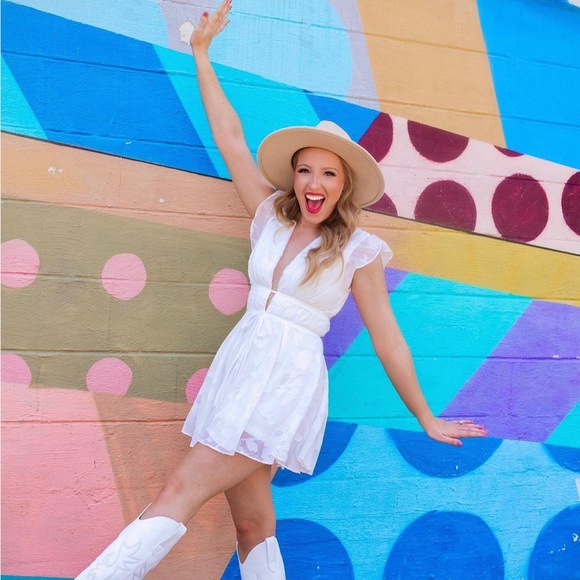 White Romper. This adorable romper is from Lulus with a deep V and an adjustable tie, so it is flattering on any body type! I only wore it once for a few hours during a photoshoot in Nashville. It’s perfect for any bride, (as it’s pretty bridal), bachelorette, engagement shoot, wedding activities!