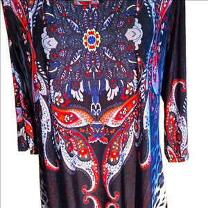 This is a vibrant, bohemian-style tunic dress with an eye-catching mix of patterns.