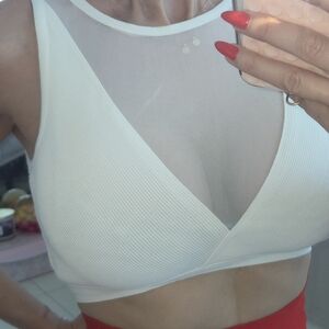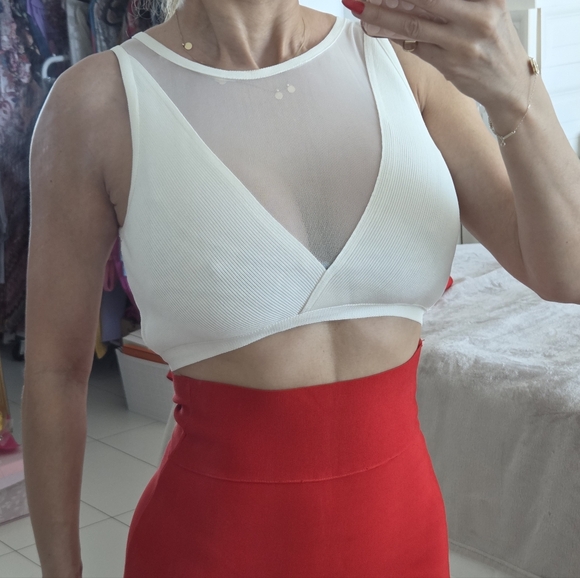 Chic white crop top with a sheer mesh inset and deep V front. Ribbed fabric provides gentle stretch and a smooth fit. Versatile layering piece that elevates casual and dressy looks. Featuring a clean scoop neckline and supportive underband for comfort.