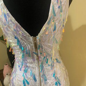 This dress has never been worn even though the tag is not attached. Accented with beautiful pink and blue sequins, you will be overwhelmed with complements