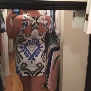 Pretty silver zipper detail visible. The back has cute cutouts over the shoulder areas. It is pretty short so would recommend for someone that is on the shorter side. Would fit anywhere from a 10-14 depending on your build