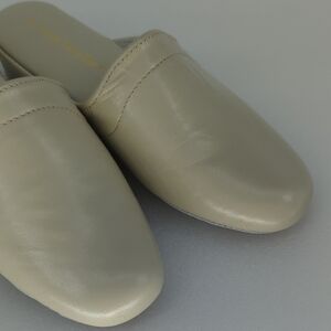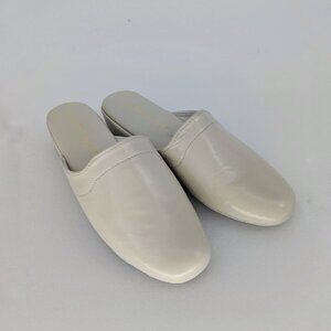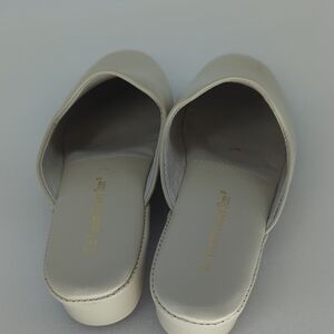 Experience ultimate comfort with these white slip-on slippers, designed for a minimalist aesthetic. Crafted with a smooth, leather-like material, they feature a rounded toe and a flat sole, perfect for casual indoor wear.