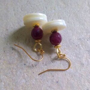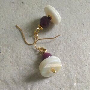 Embrace effortless sophistication with these Short Dangle Earrings, featuring luminous White Mother of Pearl Discs and vibrantly colored Raspberry Agate Beads. Gold plated stainless steel earhooks.