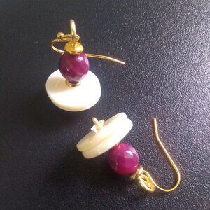 Eclectic Elegance – Short Dangle Earrings with White Mother of Pearl Discs & Rich Raspberry Agate Beads.