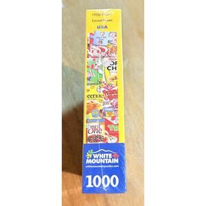 The White Mountain 1000 piece Puzzle featuring General Mills Cereal Boxes is a colorful and engaging puzzle designed for ages 12 and up. With a theme centered around food, this puzzle is perfect for puzzle enthusiasts who enjoy a challenging and rewarding activity. Made of durable cardboard materials, this puzzle is both high-quality and made in the United States. With 1000 pieces, this puzzle offers hours of entertainment and satisfaction when completed.