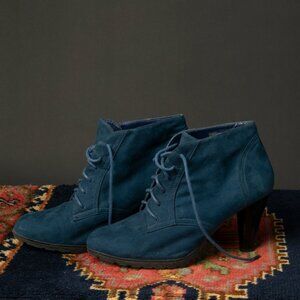 Women’s size 9; White Mountain Blue Lace Up Ankle Boots; Booties; chunky rubber soles; approx. 3 1/2 heel; suede-like fabric upper; great condition; gently worn; marks/scuffs shown (NOTE white scuffs on backs of both heels!)