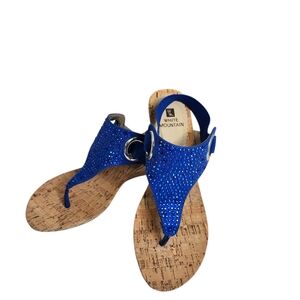 Elegant blue sandals with rhinestone accents. Features a comfortable cork wedge. Perfect for casual outings.