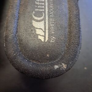 pre owned, studded upper slip ons, detailed stitching, round toe, 3" heel