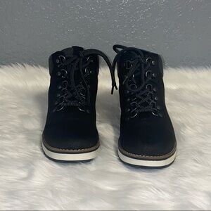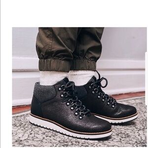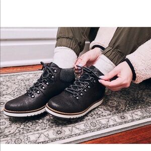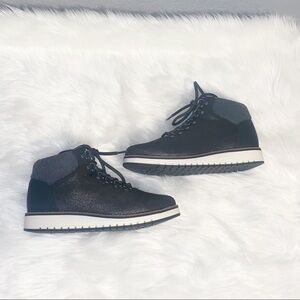 Hiker-inspired Clifton ankle boots from White Mountain. Black/ Silver Metallic color. Features rounded toe, lace-up closure, and rubber traction sole. Faux suede/fabric upper and fabric lining. Approx 3.5” shaft height. Excellent pre-owned condition. Signs of wear are as pictured.