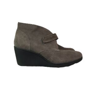 Lovely gray suede wedge ankle booties. Velcro top closure for an adjustable fit. Black wedge. Perfect to pair with jeans, leggings or tights!! Minor scuffs and markings.