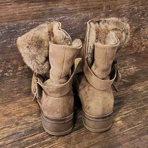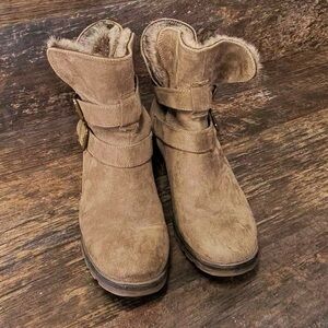 Chic light brown boots with dual buckle accents. Perfect for casual wear.