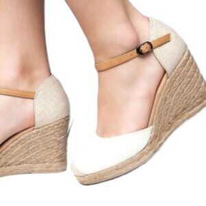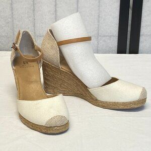 Natural Color Rope Covered Wedge Ankle Strap Mamba Espadrille Shoes from White Mountain. Outer vamp is natural cream color canvas like fabric. Heel and toe tip are textured burlap look in cream and tan. Adjustable ankle strap is tan faux leather, suede on underside. Tan suede look interior and lightly padded insole. Low platform and high wedge heel. Rope band encircles the bottom platform and then slants up and over the heel. Minimal to no signs of wear. Original box included.