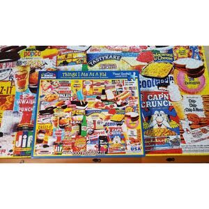Pre-Owned White Mountain Things I Ate as a Kid 1110 1000 Piece Puzzle. It is in excellent condition, done by me, stored in a ziplock bag, complete. Completed puzzle measures 24in x 30in.