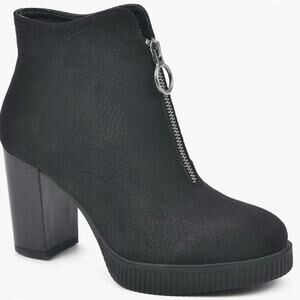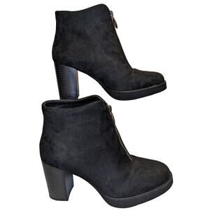 White Mountain Thoughtful Black Ankle Boots Size 10 EUC. Refine your look with this stylish bootie distinguished by a front entry zip closure for style and convenience, and a subtle platform for a hint of height. A comfortable cushioned insole and a supportive block heel make this an all day choice. Black faux suede with a decorative contrasting front zip. Textile upper with Man-made balance. Platform is approx 1/2". Heel is approx 3.25" block heel. Comfort insole..