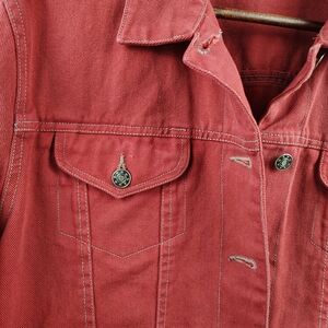 Elevate your casual style with this classic medium wash red jean jacket. Perfect for layering, it features button closures and chest pockets for a timeless look. Women's size XL.
