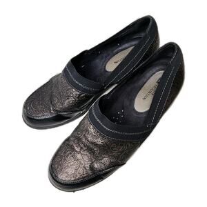 The White Mountain Women's Whimsigoth Comfort Slip-On Shoe in Bronze is a stylish and comfortable option for women. Featuring a low wedge heel and a slip-on closure, these shoes are perfect for everyday wear or casual outings. The floral pattern and metallic accents add a touch of whimsy, making them a great choice for the summer, fall, or spring seasons. With a synthetic upper material and a durable construction, these shoes offer both style and comfort for the modern woman on the go.