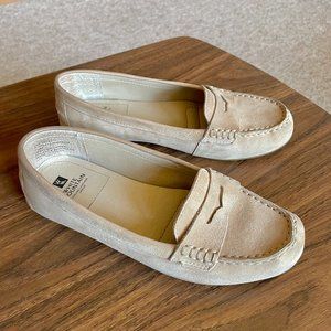 The Deutzia suede penny-moc loafer by White Mountain shoes is so sleek and features a padded insole for maximum comfort. 0.5" flat heel Shoe width- medium Cushioned insole, synthetic midsole Leather upper, synthetic lining and outsole Leather Spot Clean Condition: Very good with exception of scuff marks shown in photo Measurement: inner sole is about 9.5"/outer sole about 10"