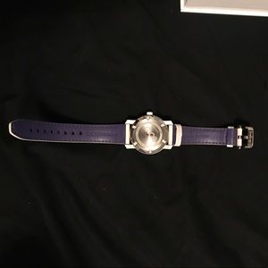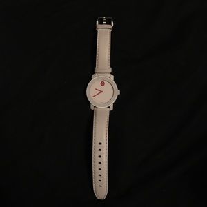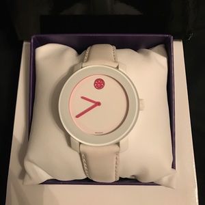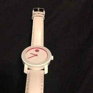 White Movado watch with pink hands and pink Swarovski circle. Leather and still in great condition. No scratches on the face. Comes with original box.