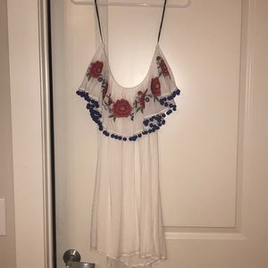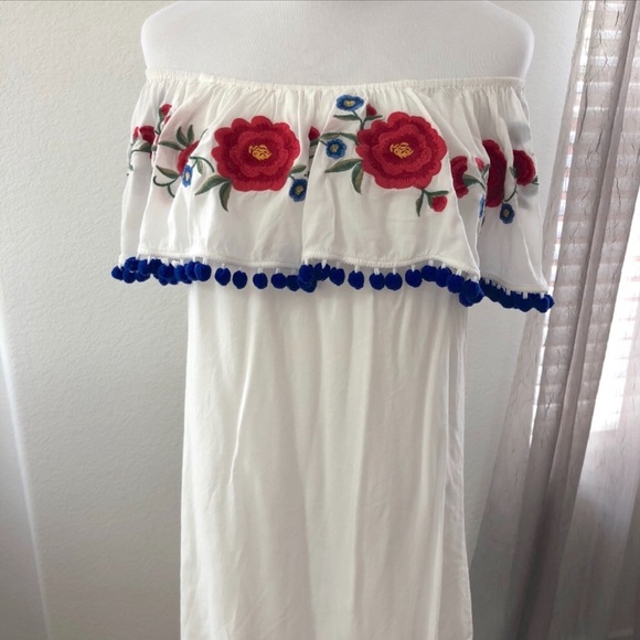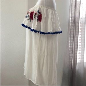 Forever 21 white off shoulder dress with floral detail and blue tassels, size small. Worn once.