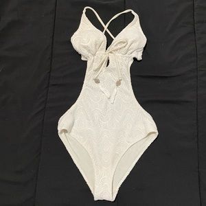 Previously owned in good condition, open back and very pretty dreamcatcher detailing on ties. Some minor discoloration, lightly lined, with open sides.