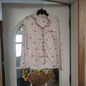 White orchid pajama set size women's petite M. They are ivory colored with cardinals the top is a button down inseam 27 inches soft stretchy material great condition worn 1 time.