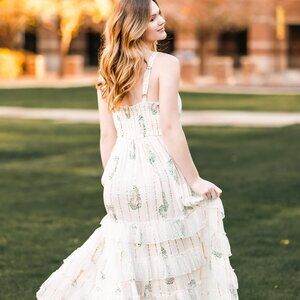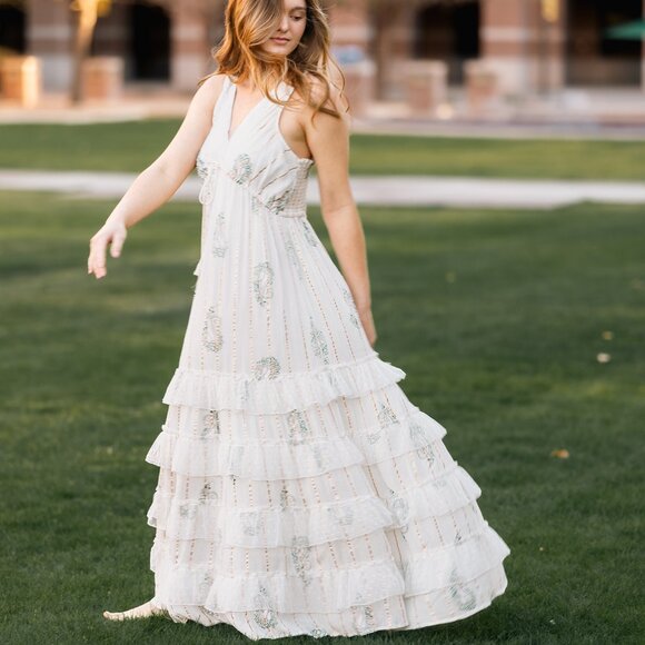 White Paisley Maxi Dress Ruffle Tiered V Neck Bohemian Beach Wedding Guest Large