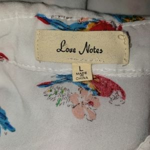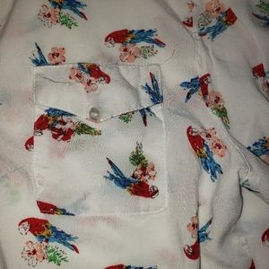 White Parrot Print Blouse Sz L Tie Front Roll-Tab Sleeves Light Novelty *STAIN*