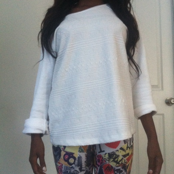 White patterned sweater oversized and very cute ! Goes with anything u want to wear :) sleeves can be adjust to the way u want them to be.