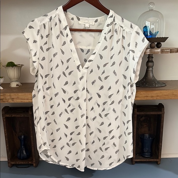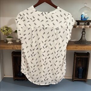 Elevate your wardrobe with this stylish white patterned flowy top with feathers. Perfect for any occasion, this top combines comfort and elegance. Never worn.