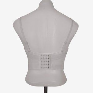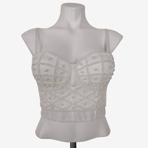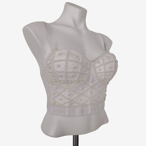 White corset bustier top, accented with white pearls. The straps are detachable so it can be worn strapless. It has underwire for support and the cups are thickly lined. Multi row, back hook and eye closure. Silicone gripping on the inside to help it stay put.