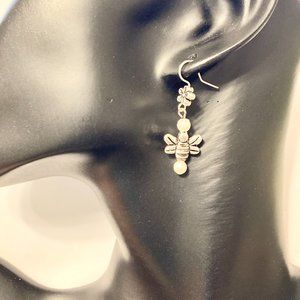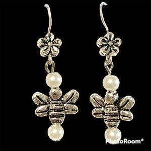 White Pearl Bumble Bee Earrings Silver Plated Dangle Insect Queen Bea Glass Bead